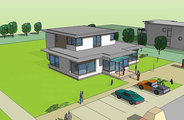 Średniej wielkości, piętrowy budynek usługowy, przewidziany do wykorzystania jako biuro lub mały sklep osiedlowy.