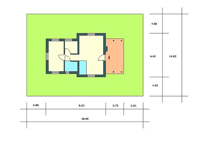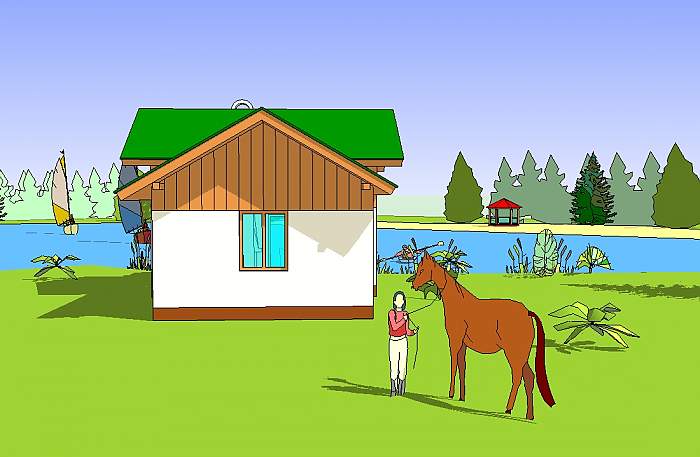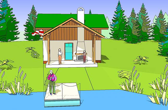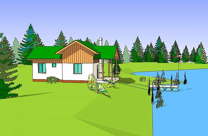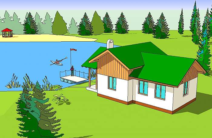 Parterowy dom letniskowy z wyraźnym podziałem na strefę dzienno – wypoczynkową i sypialną. Duży, zadaszony taras z kominkiem pozwala korzystać z niego także w niepogodne dni.