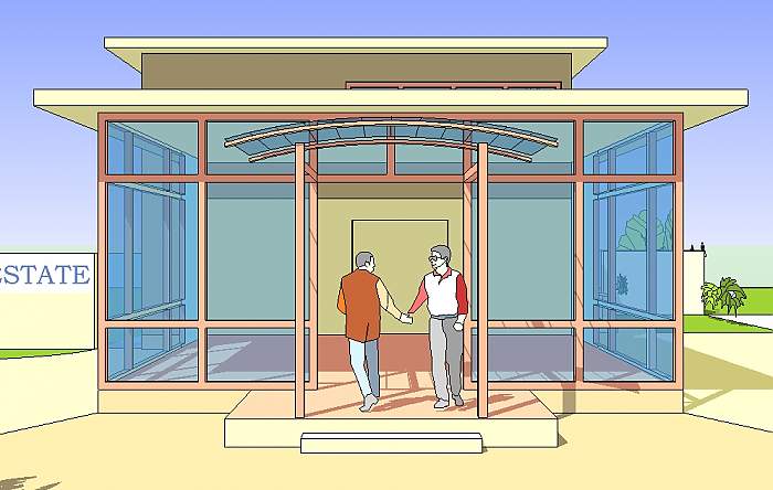 i zagospodarowania. Poprzeczny korytarz prowadzi do niewielkiego pokoju biurowego i węzła sanitarnego , a schody zamykające korytarz prowadzą do pomieszczeń biurowych na piętrze.